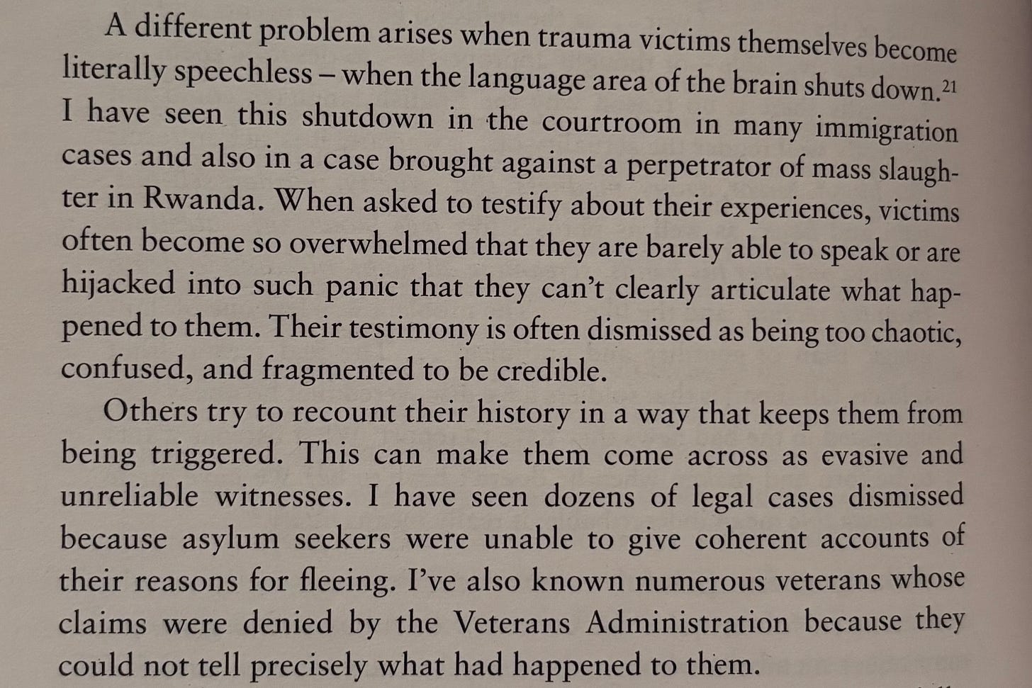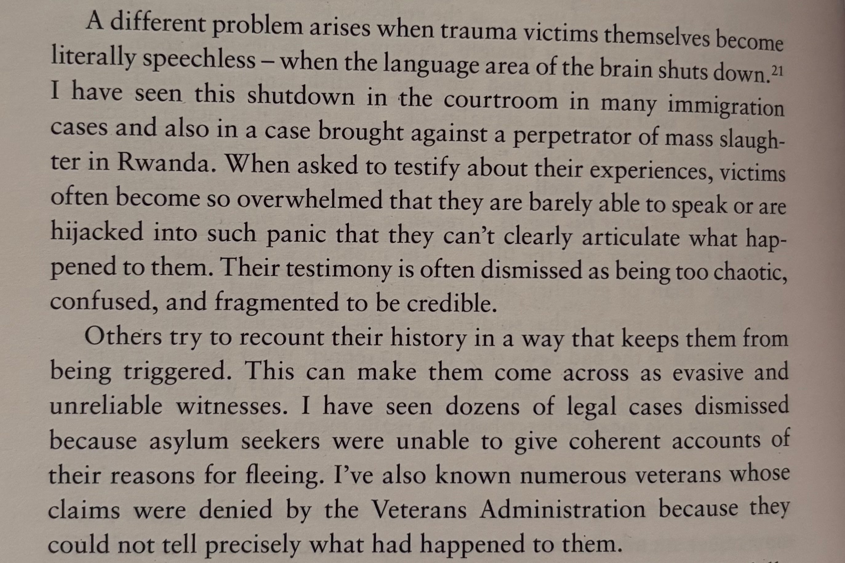 Courtrooms presume a common interpretive framework, but this falls apart when a claimant is not fluent in the language of the country, or the language of the court, or when their language breaks down under trauma. When trauma survivors experience dissociation from language, accuracy of testimony is affected. Case studies of asylum tribunals and family law provide evidence for this.